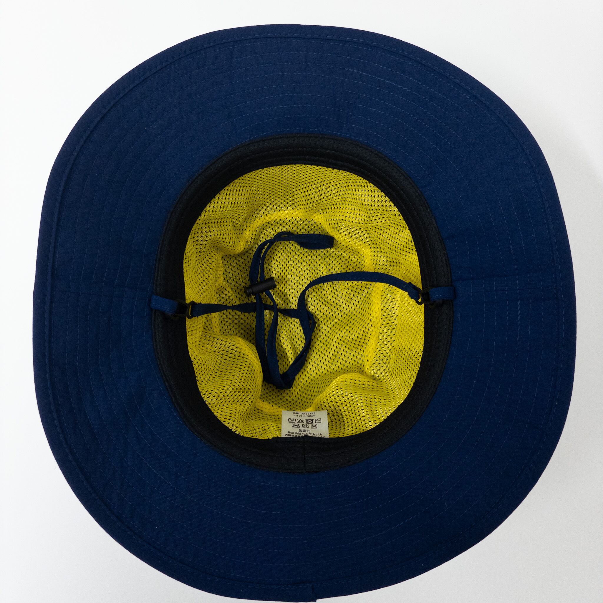 風で飛ばされないあご紐付きで、サイズ調節も可能。