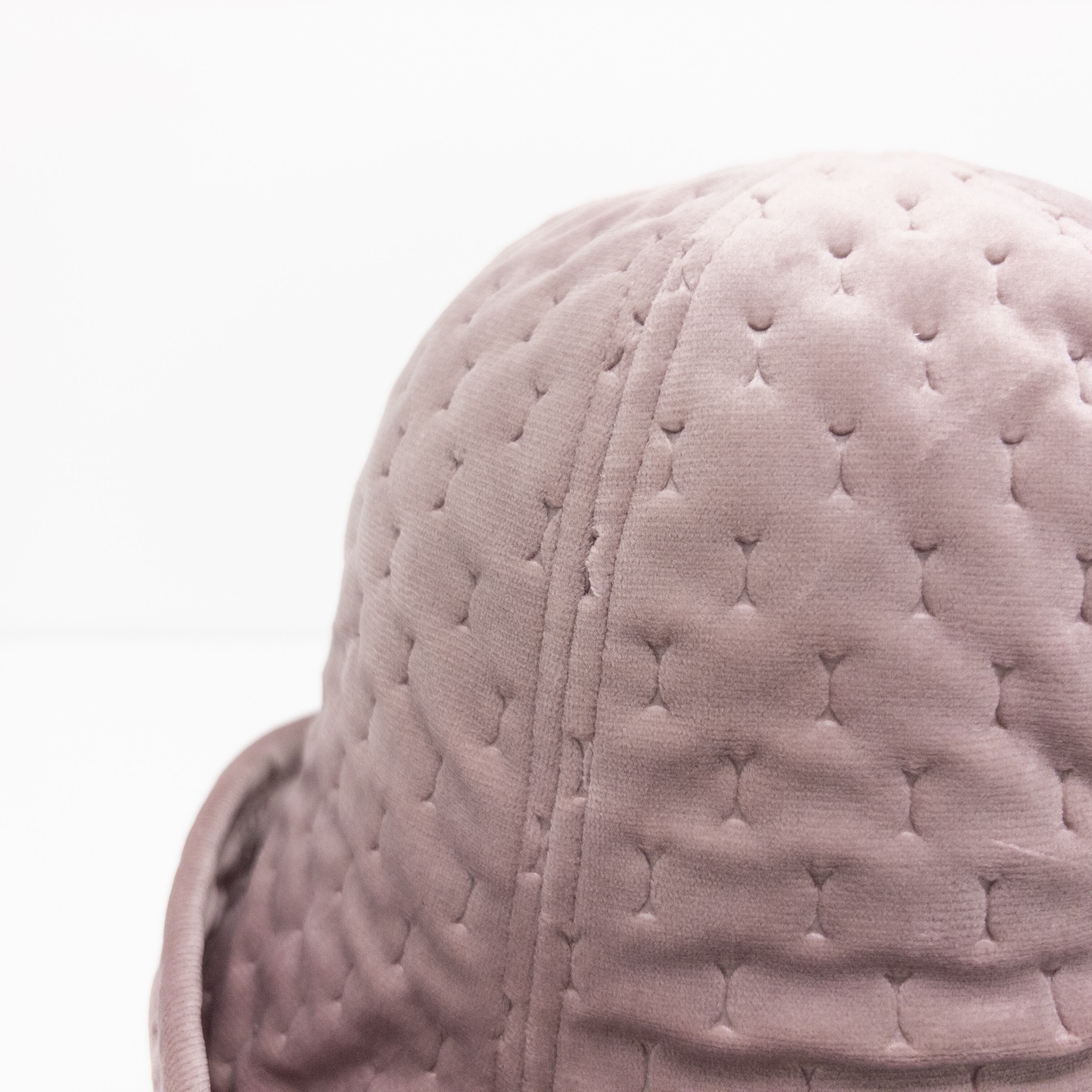 ベルベットのような上品な光沢感と、さりげないキルティング調のステッチが特徴的。丸みを帯びたクラウンから波打つようにつながるツバが、優雅な印象の**チューリップ型(またはクロッシェ型)**を形成しています。