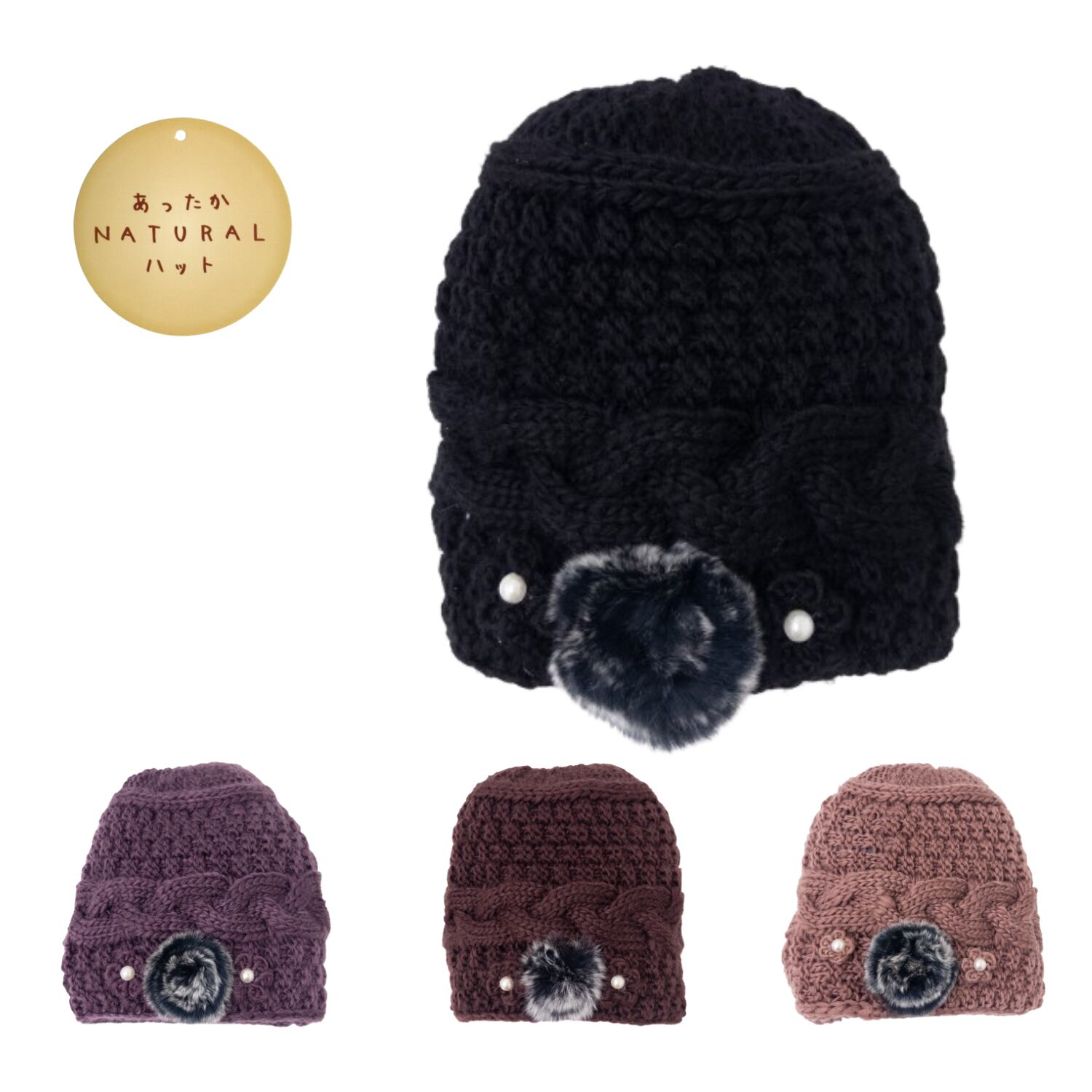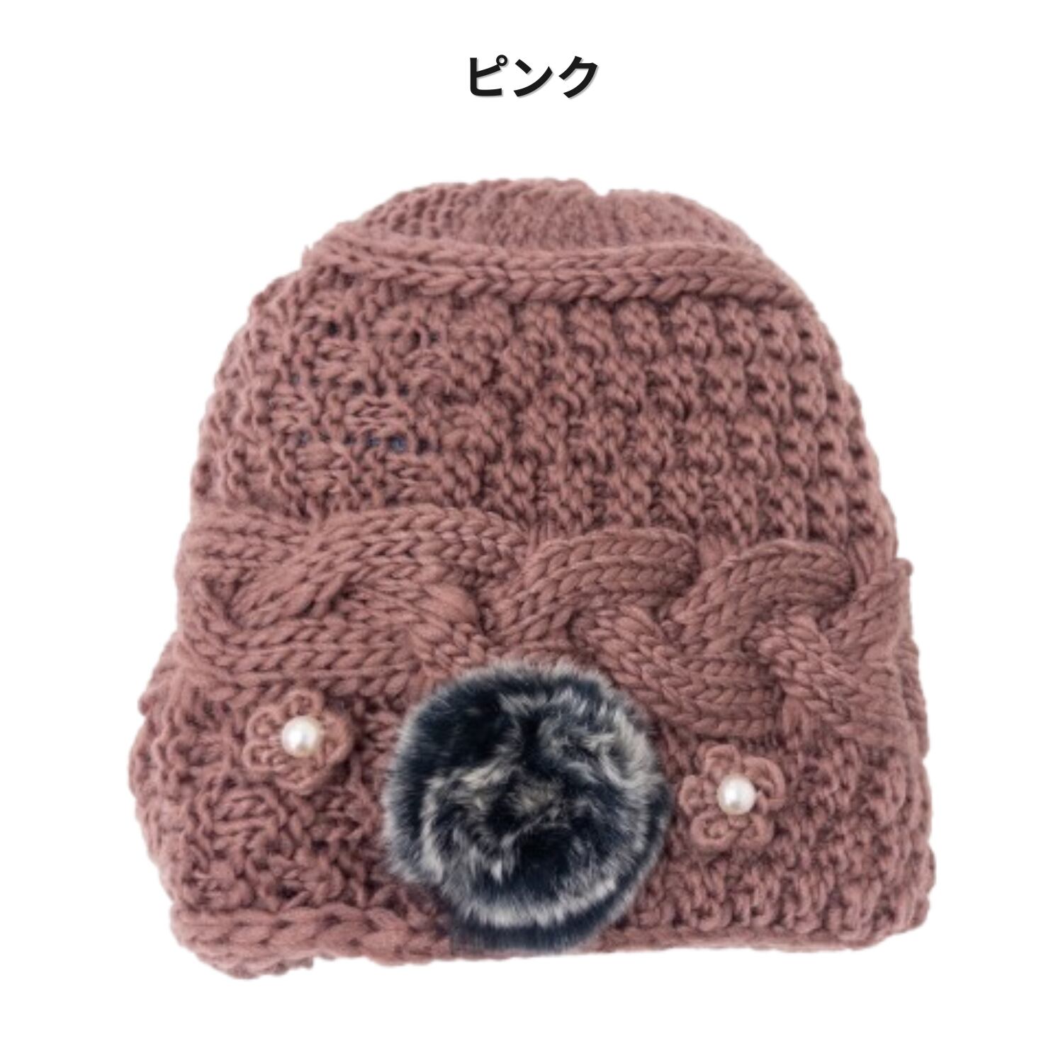 KR-703 裏ボア付き ケーブル編み ニット帽 レディース あったか 女性 ファー ラビットファー